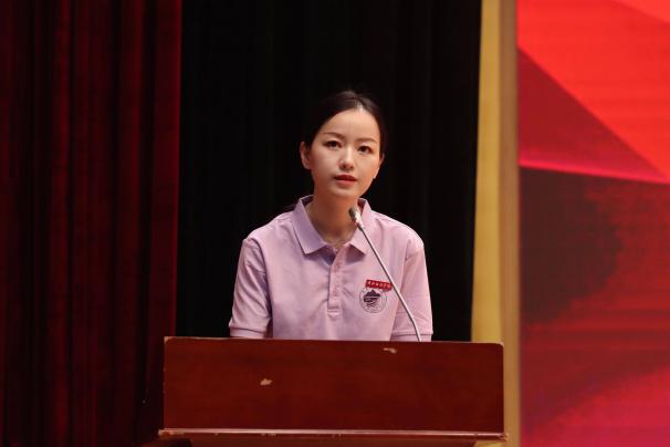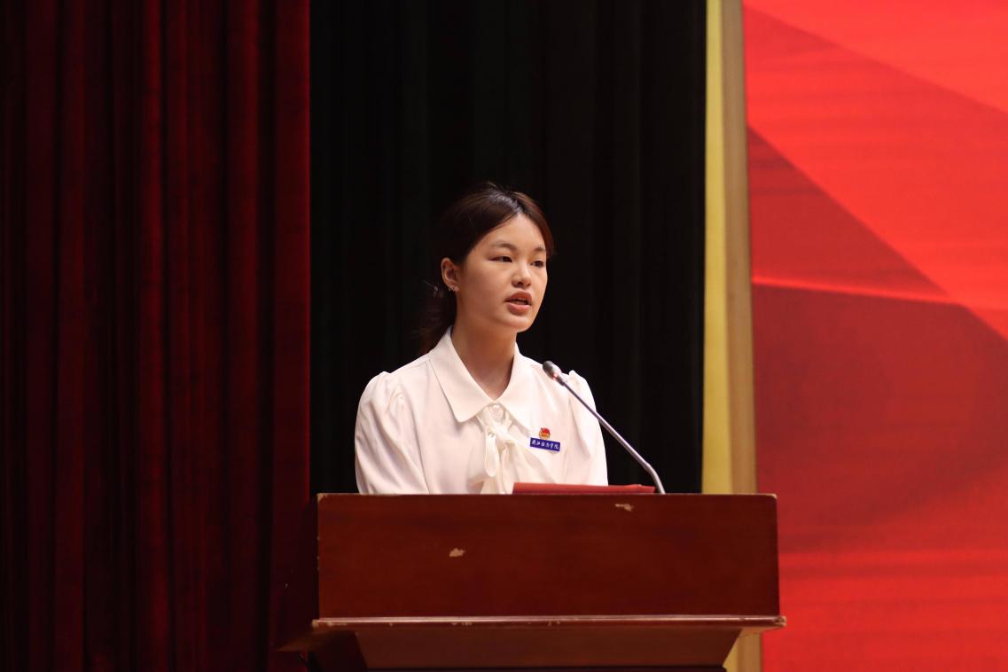 来自S402325酒店的新生代表黄可怡同学发言,作为新生代表,号召大家明确目标、勤学善思,注重实践与创新,提升综合素质。她表示将珍惜大学时光,努力学好专业知识,锤炼品格与能力,与同学们一起砥砺前行,共绘精彩人生画卷。