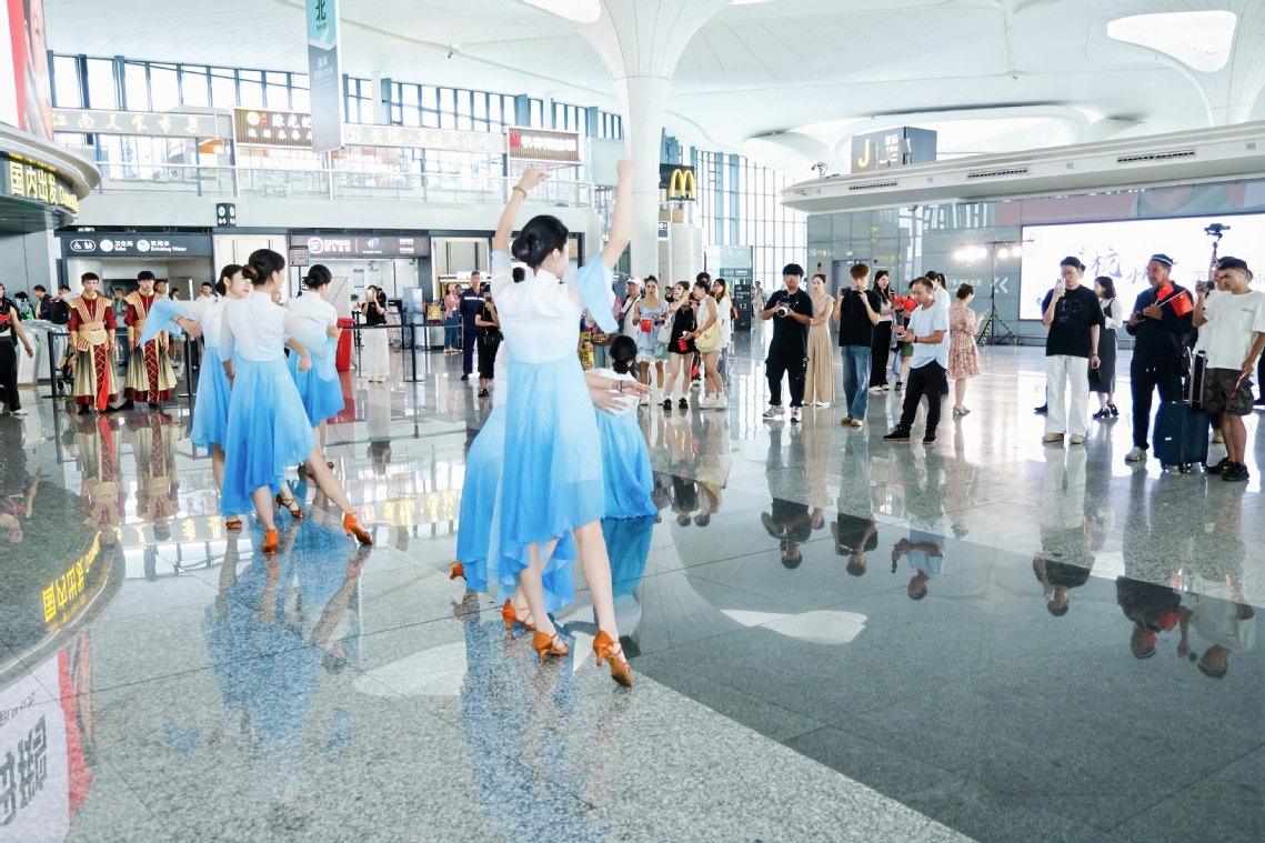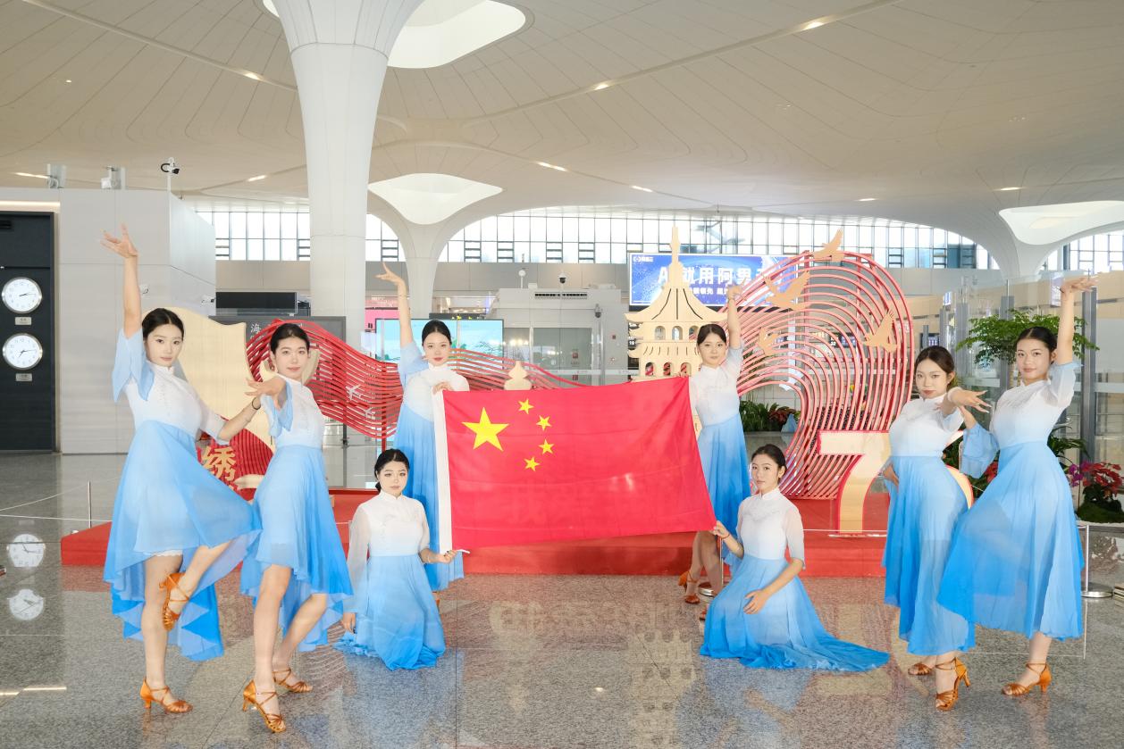 国庆献礼,闪耀空港。在中华人民共和国成立76周年之际,一场名为“筑梦空港颂伟业 云端快闪贺国庆”的主题快闪活动在杭州萧山国际机场倾情上演。浙江经济职业技术学院智慧旅游学院受邀参与演出,为机场国庆氛围注入蓬勃的高校力量。