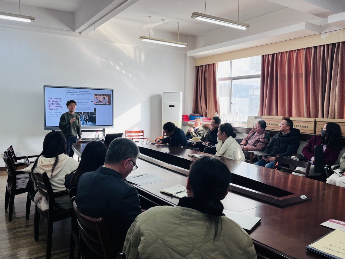12月23日下午,智慧旅游学院举办题为“文化、美食与酒饮旅游:从地方身份走向中国与东南亚的国际吸引力”的有组织科研活动。活动由新加坡管理发展学院食品与酒水行业高级讲师薛凯旋(SEE Kai Xuan)主讲,学院副院长张星主持,全体专任教师参会。