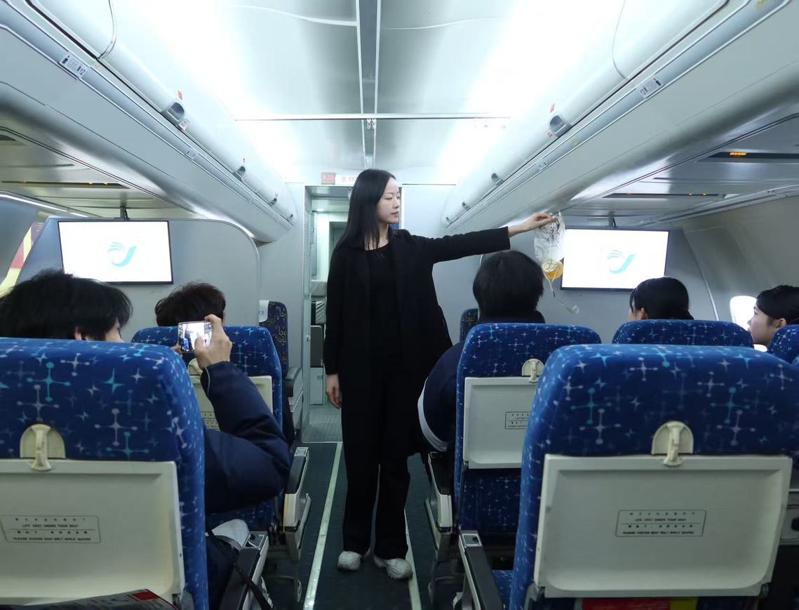 在模拟客舱内,同学们近距离观察应急设备摆放位置、客舱服务布局,直观了解空乘岗位的工作场景与专业要求。专业教师以“客舱释压”为模拟场景,结合真实案例讲解应急处置原则与操作流程,重点示范氧气面罩佩戴、旅客疏散引导等关键技能。同学们轮流扮演“乘务员”与“旅客”,沉浸式参与应急演练,从设备操作到话术引导,全方位体验空乘人员在紧急情况下的职业责任与专业素养,切实提升应急处置实操能力。