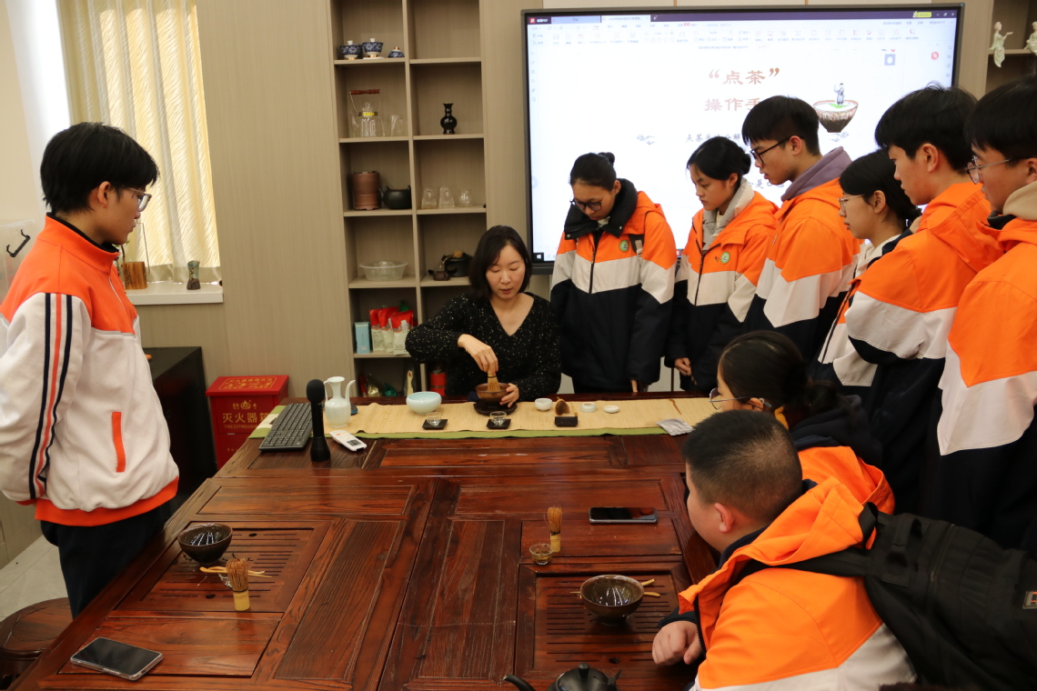 本次研学的核心环节聚焦三大特色实训室,让同学们通过“做中学,学中练,练中悟”感受专业魅力。在茶艺实训室,杨祎辰老师详细地讲解了点茶技艺的历史渊源与操作要领。从茶器选择、茶叶用量到注水手法、击拂技巧,同学们认真聆听、仔细模仿,在老师的耐心指导下,亲手完成了一套完整的点茶流程。看着茶汤表面泛起的细腻泡沫,同学们切实体会到传统茶文化的韵味与匠心。