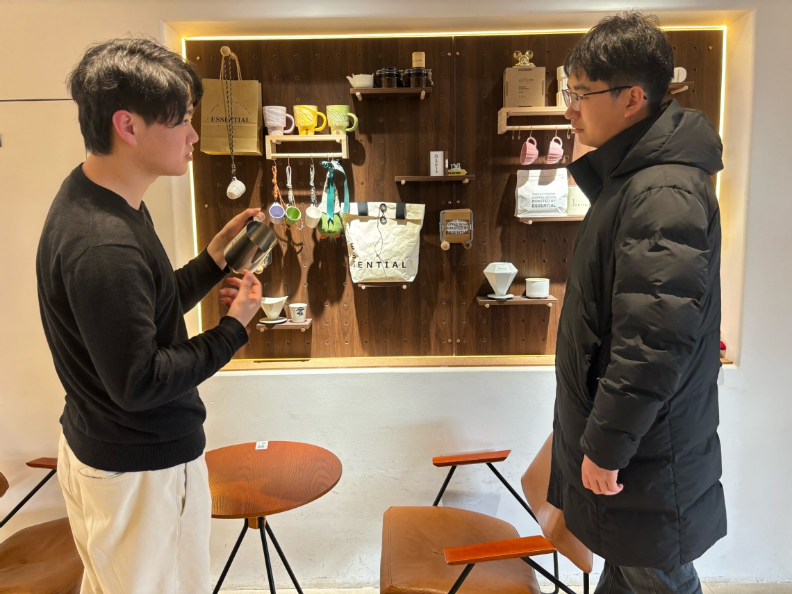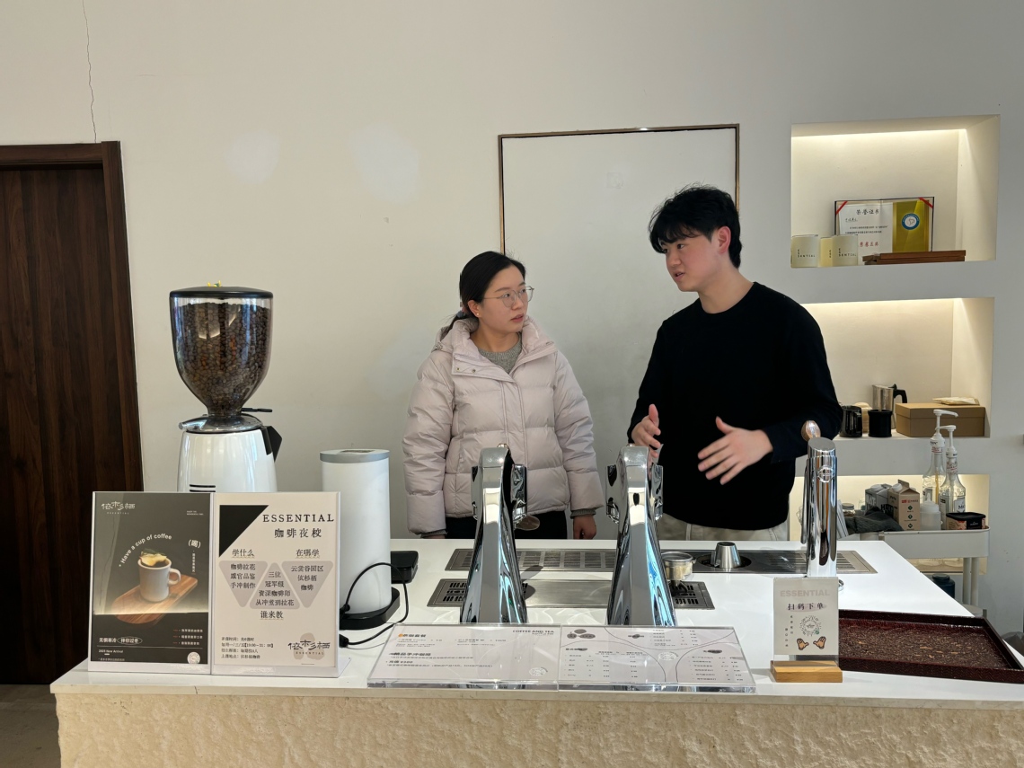 朱庆余带领老师们参观了依杉栖咖啡门店,详细介绍了店内“咖啡夜校”的课程设置与培训模式,演示不同咖啡机的功能与使用特点,展示了店内自主设计的咖啡器具及相关文创产品,并分享了门店的运营模式。